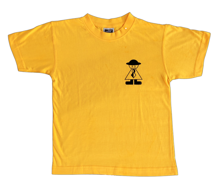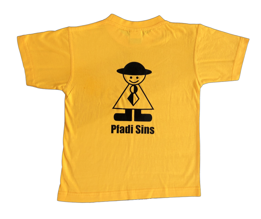 Das Pfadi T-Shirt unserer Abteilung. Es ist gelb, hat auf der Rückseite ein grosses Pfadi Sins Logo und auf der Vorderseite das selbe Logo in klein über der Brust.