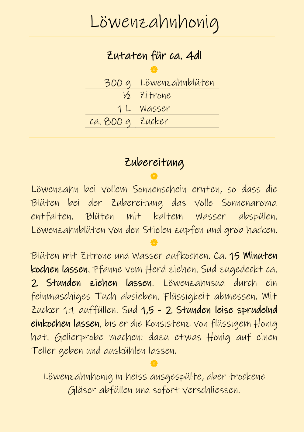Im Moment wachsen sie überall! Die sattgelben Löwenzahnblüten schmücke zurzeit die Wiesen und viele Leute wissen - mit dem Saft aus dem Stiehl ist ein natürlicher Klebstoff. Doch nicht nur der Stiehl kann gebraucht werden. Aus den Blüten kann man Honig herstellen! Wir haben es bereits ausprobiert und finden es lohnt sich total. Während bei uns der Honig beim Zmorge bereits auf dem Tisch steht könnte das bei euch in Zukunft auch sein.=) Daher haben wir euch das Rezept aufgeschaltet.